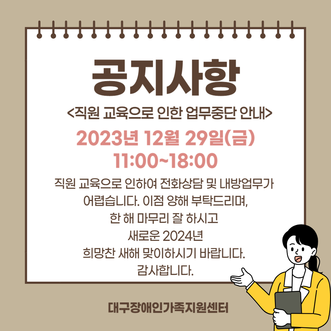 직원 교육으로 인한 업무중단 안내 최고관리자 0 1179 2023.12.27 09:51 안녕하십니까.대구장애인가족지원센터에서 안내드립니다. 전 직원이 참여하는 직원교육으로 인하여 2023.12. 29(금) 11:00~18:00은 전화상담 및 내방업무가 어려운 점 양해부탁드립니다. 감사합니다.