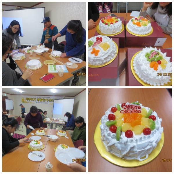 마주보기인식개선교실 크리스마스 케익만들기^^ 직접 빵에 새생크림을 발라~ 각종 과일로 나만의 케익을 만들어보아요^^ 참 맛있겠죠?~ |