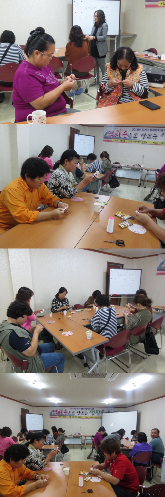 위기가정지원프로그램<엄마손으로 만든 생활공예>일정 : 2013년 10월 15일 10시~12시 내용 : 규방공예(장명루팔찌, 레이스핀봉) |