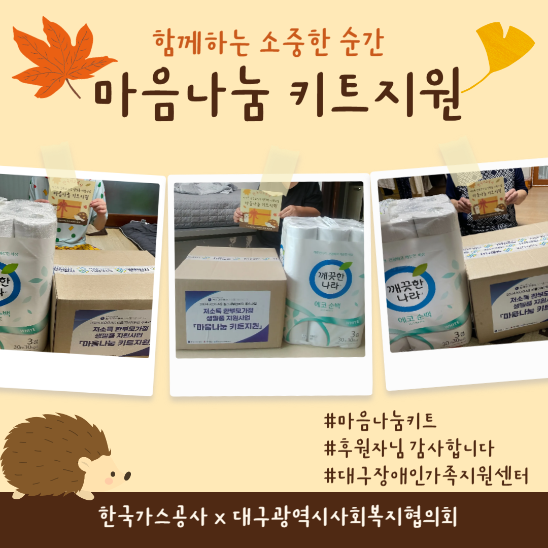 [대구광역시사회복지협의회, 한국가스공사] 저소득 한부모가정에 마음나눔키트를 전달하였습니다. 최고관리자 0 603 2025.01.13 11:40 2024년 10월, 쌀쌀해진 가을날 감사한 소식이 찾아왔습니다. 대구광역시사회복지협의회에서 후원처인 한국가스공사와 함께 가을을 맞아 저소득 한부모가정을 위한 귀중한 생필품이 들어있는 마음나눔키트를 지원해주셨습니다. 저소득 한부모가정 총 13가정에 마음나눔키트를 지원하여 힘든 가계생활에 부담을 덜 수 있었습니다. 소중한 나눔 함께해주신 한국가스공사 후원자님께 감사 인사드립니다!