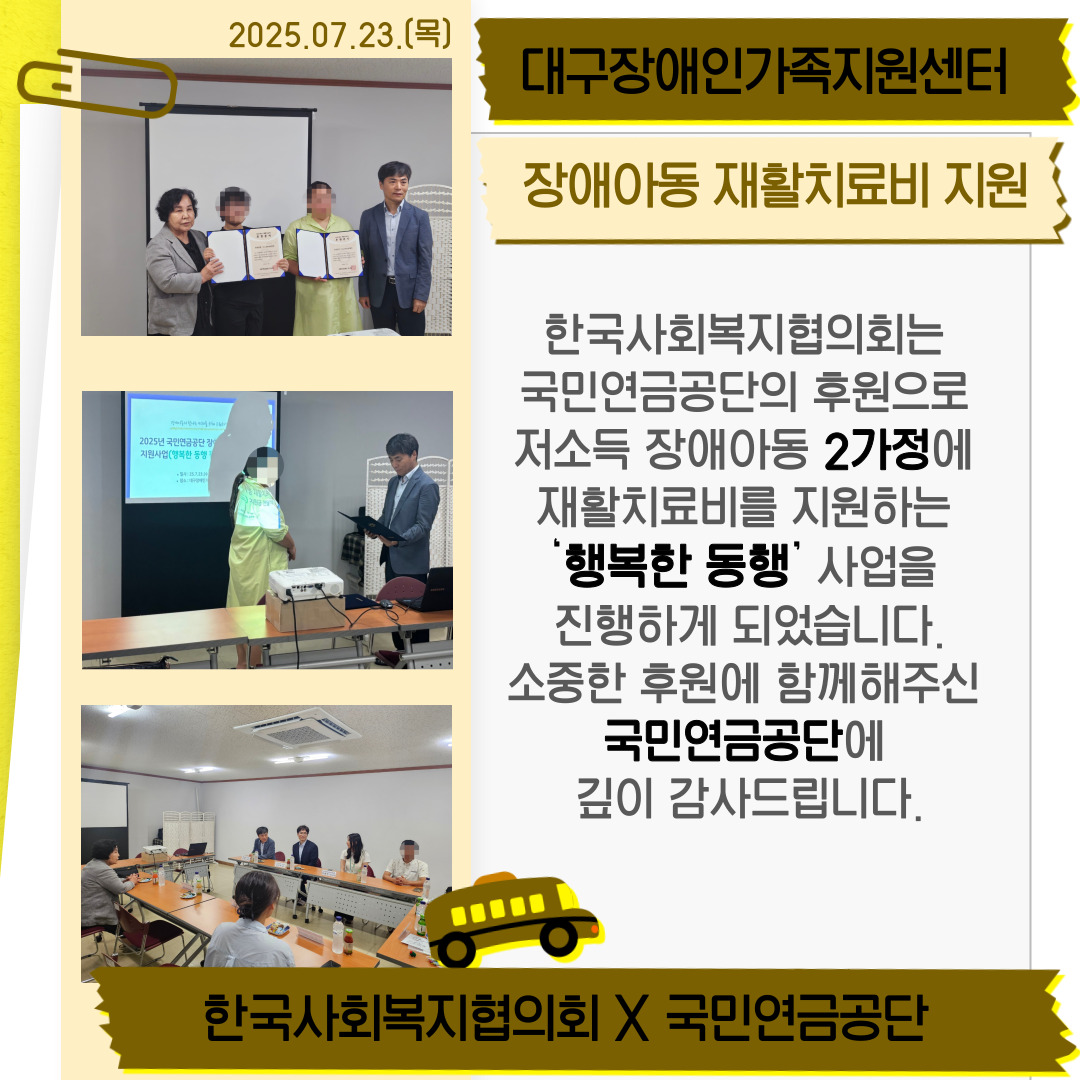 [국민연금공단, 한국사회복지협회] 저소득 장애아동 위한 재활치료비를 ‘행복한 동행’ 지원했습니다. 최고관리자 0 479 2025.07.24 14:39 2025년 7월, 또 감사한 소식이 찾아왔습니다. 한국사회복지협의회가 국민연금공단의 후원으로, 저소득 장애아동 2가정에게 재활치료비를 지원하는 ‘행복한 동행’ 사업에 지원해주셨습니다. 이번 지원을 통해 재활치료가 절실하지만 경제적 이유로 치료에 어려움을 겪던 장애아동 가정에 실질적인 도움이 되었습니다. 아이들이 보다 건강하게 성장할 수 있는 발판이 마련된 소중한 기회였습니다. 따뜻한 나눔을 함께해주신 국민연금공단에 진심으로 감사드립니다!